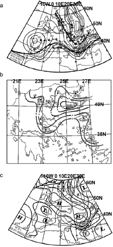 Metaxas (1970), in agreement with Constantakopoulos (1959), discriminates between two types of onset of Etesian wind outbreaks without diurnal variation of the wind intensity on the first days: type w when the anticyclone reaches the Balkans from the west and type n when the anticyclone reaches the Balkans from the north. However, the 10 years of (b) data for July and August 1991-2000 used to apply the well-known subjective method to surface and 500 hPa synoptic charts, verify the existence of two more types of outbreaks onset with very low frequency of occurrence: type s and type c. The first one is associated with the establishment of a subtropical anticyclone in the central Mediterranean, extended eastwards and northeastwards, as mentioned above, rising the barometric pressure over the Balkans. In this case, the weather that occurs in Greek territory is different than during the onset of the other types, as the 2 m temperatures are much higher, there is no rain even in northern Greece and the strong Etesians are restricted around Naxos and southwards (Fig. 1). Type c could be considered as a specific gradual transformation of types w or n. As both study cases analyzed showed, when the SJS is located over the Greek mainland at about 200 hPa and travels through the north Aegean Sea and North Turkey to Iran and at the same time the PJS or a polar jet streak, associated with the Rossby wave train and the surface front, approaches Greece (see Figs. 3 and 7), an interaction occurs between the two jets.