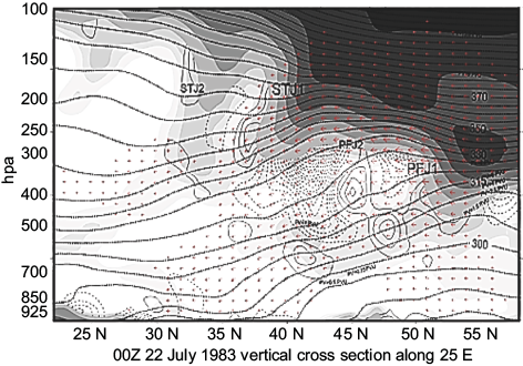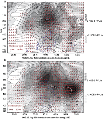 In addition to the horizontal interaction of the two jets, the vertical interaction is better illustrated on cross-sections. Cross-sections along 23º and 25º E were constructed, extending from 20º to 60º N. The cross-section along 23º E from 18:00 UTC on July 21, 1983 is depicted in Figure 5a. The main branch (small region around a point on the jet axis with maximum wind) of the PJS is located at 51º N and 300 hPa, with a northwesterly direction (see Fig. 3). Its associated PJS is located at 51º N and the cold tropospheric air mass reaches a level of 400 hPa at the northern end of the cross-section, with its tropopause dropping down to 600 hPa, whereas warm stratospheric air masses are located above this, in accordance with the PV balance. The main branch of the SJS is located at 38º N and 200 hPa. As already seen in Figure 4a, both jets have a northerly component, but that of the PJS is almost three times stronger than the SJS. This indicates a tendency of the large-scale flow to promote confluence between the two jet streams above Central Europe and the Balkans. A confluent flow is conducive of frontogenesis. Indeed, an upper-level front (ULFnt) is visible in the cross-section bounded by the 315 K and 325 K isentropes, extending from 300 hPa at 46º N, down to 700 hPa at 36º N.