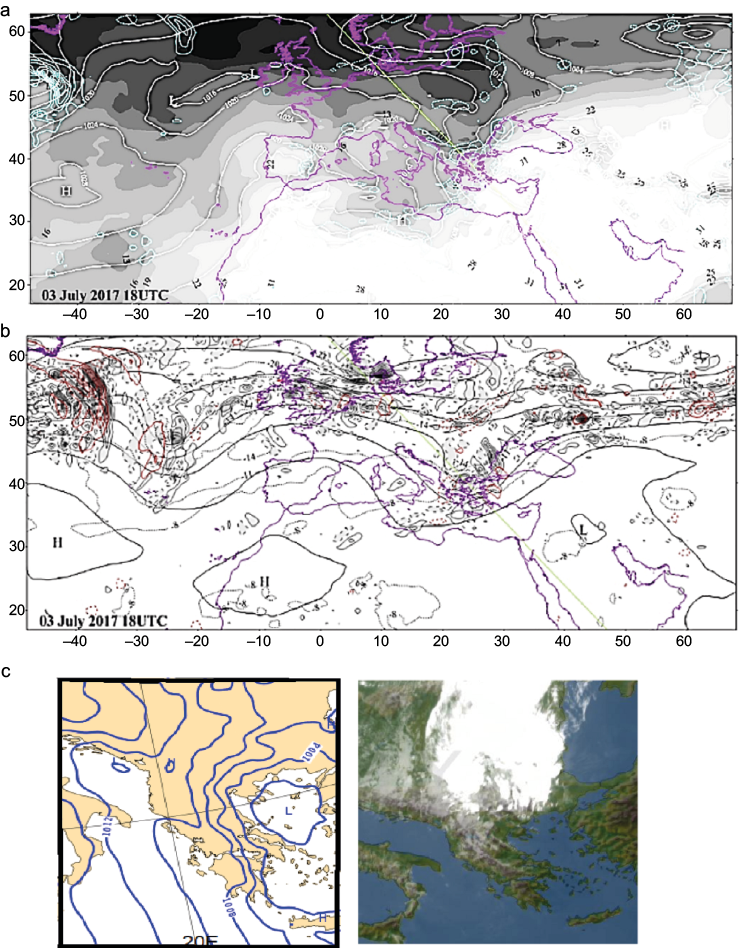 We consider now a case of Etesian outburst of type w, according to Metaxas (1970). In this case, an ordinary area of positive absolute vorticity advection began to appear in the morning of July 3, 2017 over the Greek territory, where conditional instability prevailed. This advection is associated with a normal, relatively small amplitude Rossby wave trough, moving from west to east. This trough was situated just east of the Iberian Peninsula (not shown) on June 26, triggering the physical mechanism for the meandering of SJS further northwards (Prezerakos, 1989). It was then located over Greece resulting in a rather short heatwave, which lasted more than three days. The possible impact of the West African Monsoon (WAM) upon the meandering northwards of the SJS is discussed in the next section. A detailed discussion of the heatwave that affected Greece from June 29 to July 3, 2017 was prepared by N. Karatarakis and A. Lalos, Directors of Climatology and Forecasting Departments, respectively, of the Hellenic National Meteorological Service. It is available at www.hnms.gr.