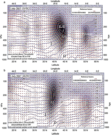 On July 3, the god Aristaeus, unwilling to see any more suffering due to high air temperatures, decided to send his Etesian winds to relieve them. A SFCFnt ahead of a 500 hPa trough (Fig. 7a, b) moved over the Balkans on July 3, thereby establishing fresh Etesian winds with a significant drop in air temperature, as shown in Figure 7a. The SFCFnt, together with the Rossby wave, is steered by a polar jet streak, which meets the SJS on July 2 as shown by the northwest-southeast oriented cross-section of Figure 8 (see Fig. 7a). In this cross-section (Fig 8a), the SFCFnt is clearly seen northwest of Thessaloniki at 44º N. A thermally direct (D) circulation is observed in the section-parallel flow field (red arrows), centered at the SFCFnt and extending up to about 500 hPa. The frontal surface extends vertically up to just beneath the PJS, where part of the frontal ascent diverges southward and subsides, thereby forming what appears to be a thermally indirect (I) circulation under the SJS. The two jets have not yet merged completely, which is consistent with an upward kink of the tropopause between them. Subsidence prevails all over the Aegean Sea, maintaining high surface air temperature southeastwards of Rhodes, which remains inland until the cross-section plane meets the Arabian Peninsula and a low-level ascent appears due to diabatic Newtonian heating. Over the western Arabian Peninsula and higher than 500 hPa, convergence occurs, and this stabilizes the 500-350 hPa layer. Above 350 hPa the atmosphere shows weaker stability, and at the same time the tropical easterly jet appears. The influence of the tropical easterly jet is limited to the Arabian Peninsula, where the air flow above 300 hPa seems to be southeasterly; this means that the air is quite far from its starting point (area of strong tropical convective activity) and has already diverged northwards for being southwesterly and then westerly when it reaches the SJS.