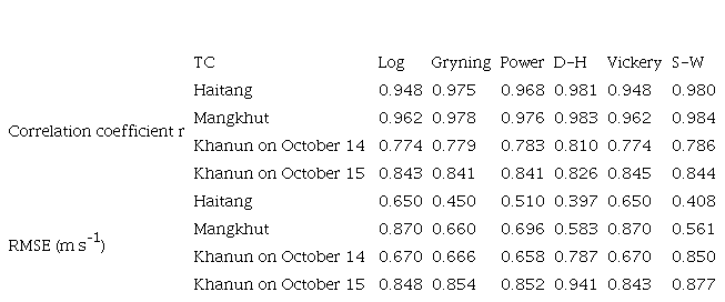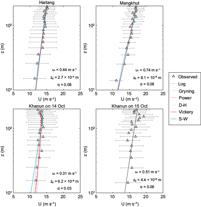 The fitting results of the wind profiles are shown in Figures 6 to 8, and the corresponding goodness-of-fit statistics are listed in Tables I to III. As suggested by Figure 6 and Table I, all the composite mean wind profiles in TC outer vortex show a logarithmic decay of wind speed with height over 10-200 m, which agrees with Powell et al. (2003), Tse et al. (2013), etc. While the fitted roughness length z0 for Haitang and Mangkhut is in the order of 10–4-10–2 m and comparable with previous research (e.g., Powell et al., 2003; Donelan et al., 2004), fitted z0 for Khanun is unusually small (in the order of 10–9-10–6 m). This phenomenon deserves further research. There is little difference between the performances of the six wind profile models in describing the observed wind profiles in terms of correlation coefficient and RMSE.