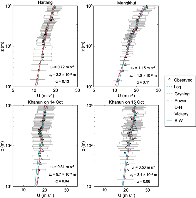 Figure 7 and Table II show the fitting results of TC outer vortex wind profiles over 10-1000 m. It is observed that the logarithmic regime extends up to 1000 m, although the slope of the profile (therefore the fitted z0) may differ from that in the near-surface levels lower than 200 m. This agrees with radar observations of TC stratiform rainbands over land by Donaher et al. (2013). Low-level wind maxima below 1000 m are not captured in these profiles, and there is no evidence that the Vickery or S-W models perform better than the other models. It is noteworthy that wind speed does not remain unchanged above hg of 250-550 m, which disagrees with stipulations in most building codes.