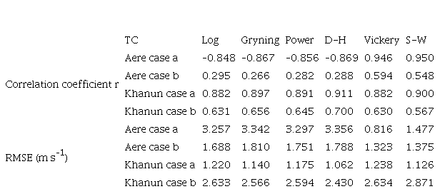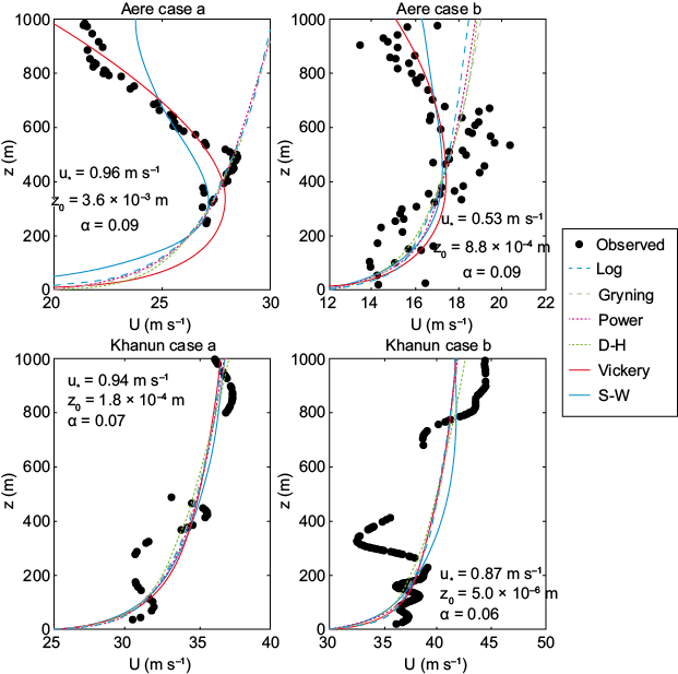 Eyewall wind profiles over 10-1000 m are depicted in Figure 8, and the goodness-of-fit statistics are shown in Table III. It is found that in Aere’s eyewall, the wind speed increases logarithmically up to a height of 500 m, followed by a decrease until 1000 m. The Vickery and S-W models outperform the other four models in depicting this jet-like feature, especially for case a (see upper left panel in Fig. 8), where only the Vickery and S-W models yield positive correlation coefficients. However, in Khanun’s eyewall, jet-like features are not found in the lowest 1000 m. Wind speed generally increases with height despite the presence of some small-scale fluctuations. There is no significant difference between the goodness-of-fit of the six profile models in Khanun eyewall cases.
