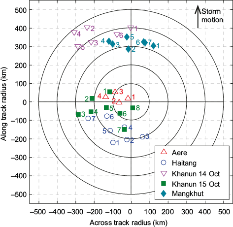 The storm center locations and translational speeds were determined based on the International Best Track Archive for Climate Stewardship (IBTrACS) database (Knapp et al., 2010). A linear interpolation was applied to provide a continuous estimate of the storm center’s location. The dropsonde locations were adjusted to storm-relative coordinates, as shown in Figure 1. Note that open symbols represent dropsonde locations for intensifying TCs (Aere, Haitang, and Khanun on October 14), while filled symbols represent dropsonde locations for non-intensifying or weakening TCs (Khanun on October 15 and Mangkhut). It can be seen that most of the dropsondes were deployed on the left side of the moving storms, where the wind strength is generally lower than the right side. The overwhelming majority of the dropsondes were launched in the outer vortex with distance from the storm center larger than 100 km, while two dropsondes for Aere and two dropsondes for Khanun were released within 100 km from the storm center.