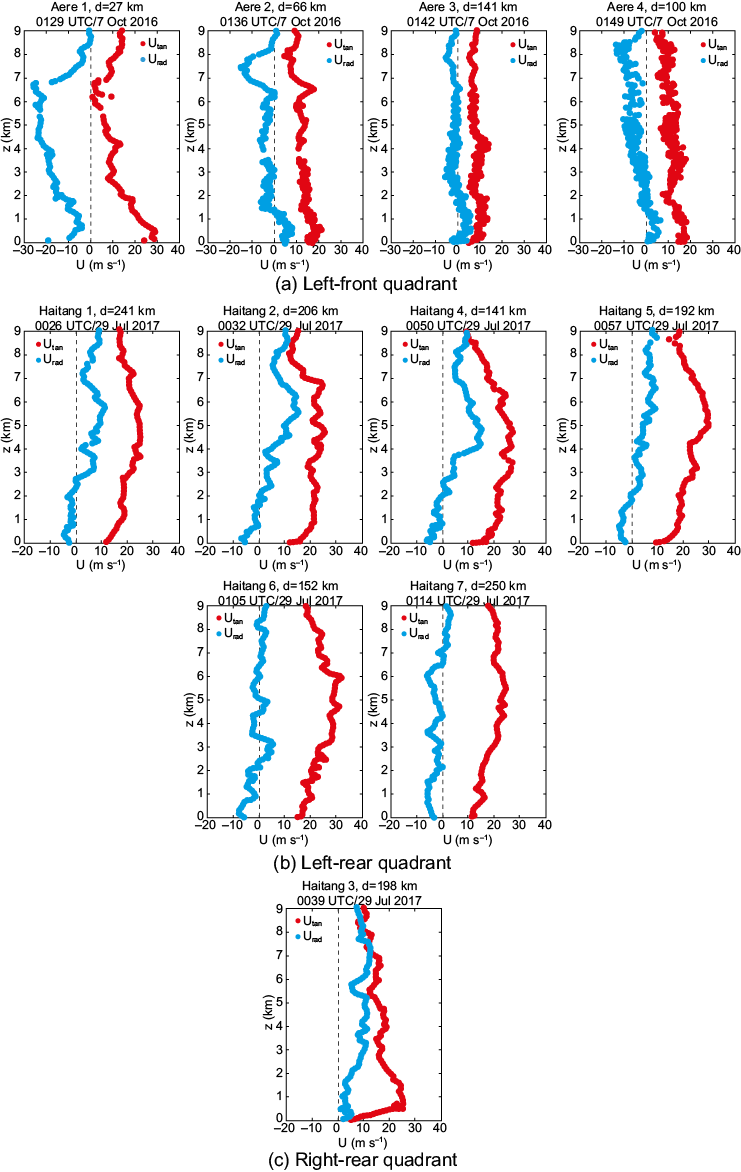 The second source of uncertainty arises from the horizontal drifts of the dropsondes. The dropsonde follows a Lagrangian trajectory and may drift both tangentially and radially relative to the storm center while descending. In the present study, the drift distances of the dropsondes are mostly within 20 km in the tangential direction and 5 km in the radial direction. The drifts of dropsondes in the radial direction towards the surface wind maximum may lead to stronger reported winds and weaker vertical wind shear near the surface (Powell et al., 2003), and the near-surface portion of the dropsonde profile may depart from what would be anticipated below the upper portion of the profile (Zhang et al., 2018).