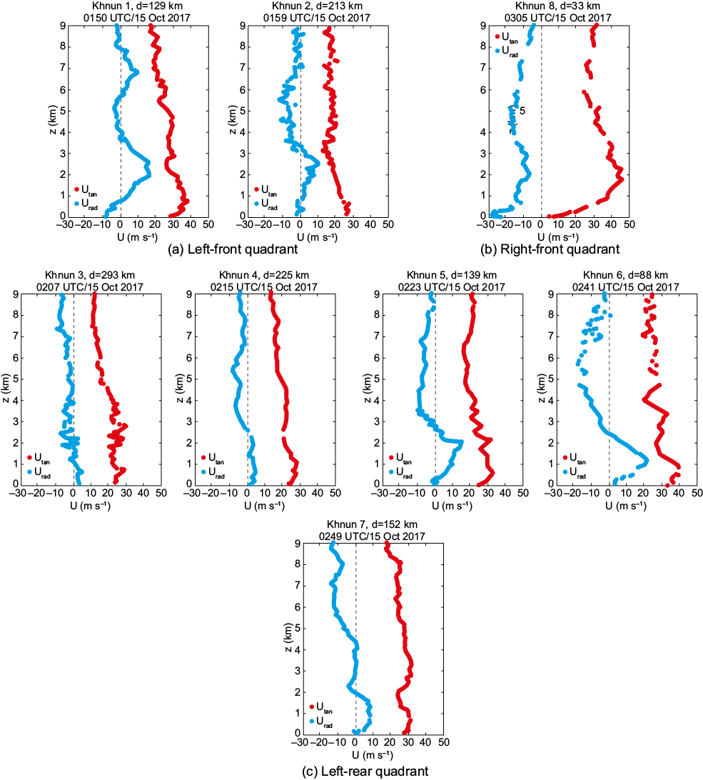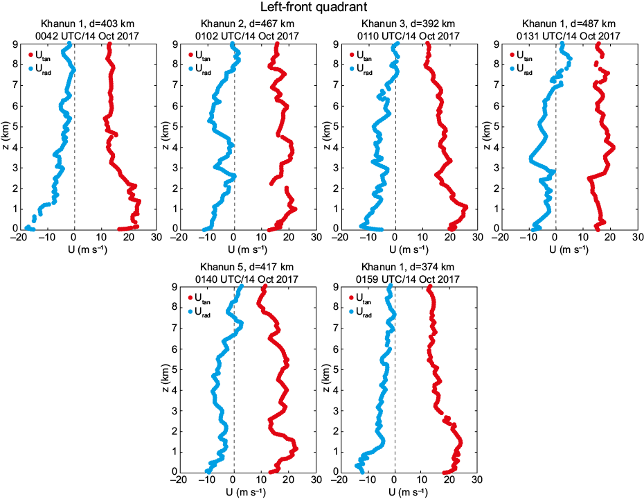 The storm intensifying cases are Aere and Haitang, with intensification rates of 5 kt 6 h–1 (Fig. 2), as well as Khanun on October 14 with intensification rate of 10 kt 6 h–1 (Fig. 3). As expected for a TC over the Northern Hemisphere, the tangential components are all anticlockwise. In the Aere cases, there is neither marked inflow or outflow except for case 1 near the storm center. It is speculated that the vertical wind profiles of Aere are twisted by the environmental wind shear. The actual inflow directions would need to be further analyzed by considering the large scale (synoptic scale) atmospheric flow at the time. The inflow layer depth of Haitang is generally around 2 km in the left-rear quadrant, which is somewhat smaller than the height of the maximum tangential wind speed about 5 km. However, in the right-rear quadrant, the inflow is not significant. In some cases (6 and 7), there is neither marked inflow nor outflow between 2-9 km, while in other cases the outflow layer spreads above 2 km. Khanun, which underwent rapid intensification on October 14, features a deep inflow layer. The inflow layer depth generally exceeds 7 km, significantly larger than the height of the maximum tangential wind speed around 1.5 km.
