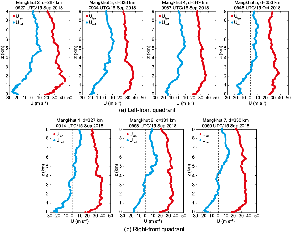 The mature storm case is Mangkhut with wind strength remaining at 100 kt (Fig. 4). Strong inflow with radial wind speed at 20 m s–1 at a height of 300 m was observed in most cases. Weak outflow was found between 4-9 km. The inflow layer depth around 2 km is comparable with the height of the maximum tangential wind speed. The observed strong inflow may be attributed to concentric eyewalls of the storm (He et al., 2020).