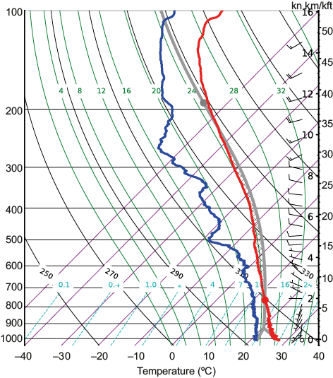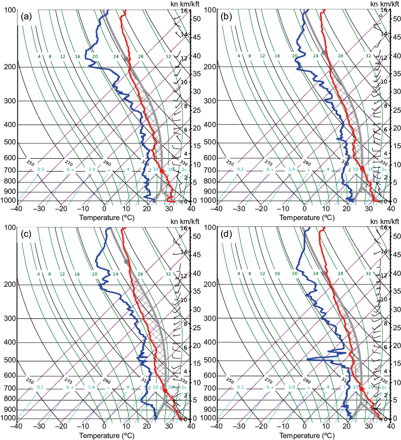 To analyze the behavior of thermodynamic parameters during the classified days (Table I), upper air sounding data was plotted in SkewT/LogP diagrams using the SkewT 1.1.0 Python software package (https://pypi.python.org/pypi/SkewT) and the MetPy Python package (https://pypi.org/project/met/) was used to calculate the thermodynamic parameters.