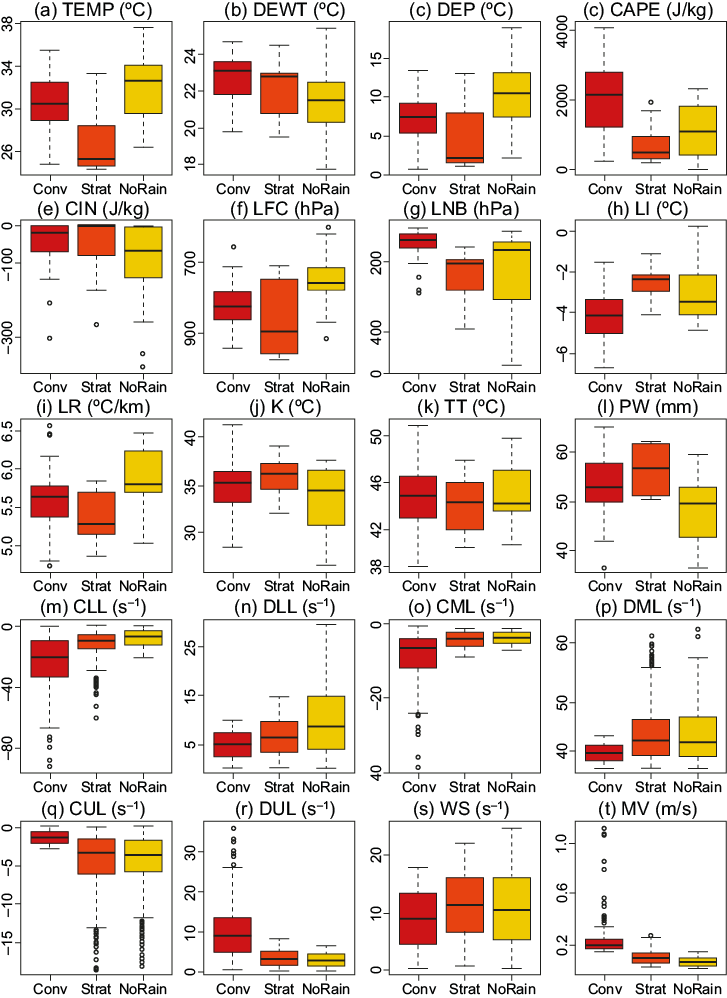 Figure 11 shows thermodynamic variables and dynamic variable boxplots for convective (red), stratiform (orange) and nonprecipitating (yellow) cloud days. The thermodynamic parameters (Figure 11a to 11l) were calculated using the upper air sounding data collected during the experiments. The dynamic parameters were calculated using the results of the WRF numerical model. Given the spatial diversity of wind convergence and wind divergence, a region surrounding the campus of Federal University of Rio de Janeiro (UFRJ) was used to evaluate the local effects of this trigger during the thirty days (Table I).