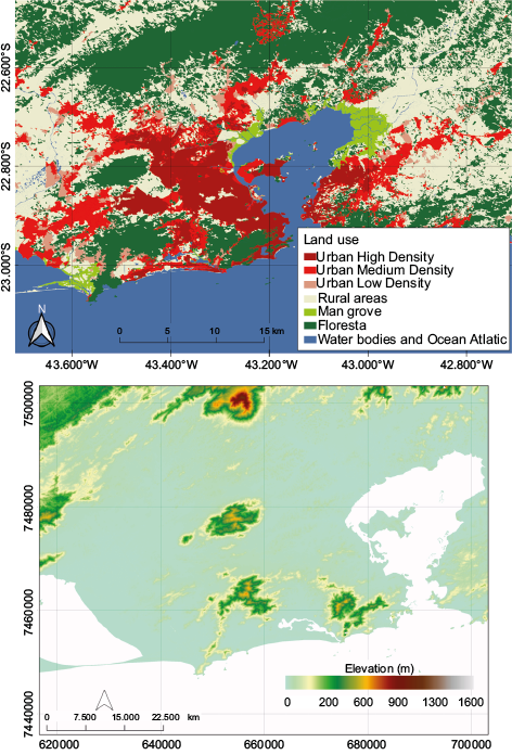 Atmospheric phenomena over the metropolitan area of Rio de Janeiro (Figure 1) are mainly related to the presence of the South Atlantic Convergence Zone (SACZ) (Ferreira et al., 2004; Seluchi and Chou, 2009), frontal systems (Seluchi and Chou, 2009; Dereczynski et al., 2009) or isolated convective systems (Britto et al., 2016). Figure 1S shows land use (top) and digital elevation model (bottom) of the metropolitan area of Rio de Janeiro (MARJ). Especially during the warm season, the proximity of Atlantic Ocean and different types of land use creates low-level atmospheric instability as a consequence of solar heating and evapotranspiration. The mountainous area of MARJ acts as a dynamic trigger for cloud development, which may lead to the occurrence of high rainfall accumulations, and local natural hazards such as floods and landslides (Roe et al., 2003; Barros et al., 2004; Boers et al., 2015; Oakley et al., 2017, Silva et al., 2016; Dereczynski et al., 2017).