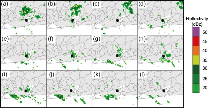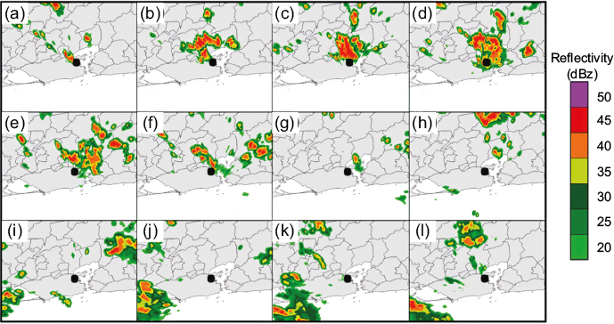 Radar reflectivity was used to diagnose and classify cloud types (Hagen et al., 2000; Punkka and Bister, 2005; Goudenhoofdt and Delobbe, 2013; Yang et al., 2013). Convective clouds are characterized by reflectivity echoes greater than 40 dBZ, while stratiform clouds present reflectivity between 20 dBZ and 40 dBZ and so-called nonprecipitating clouds present values lower than 20 dBZ (Hagen et al., 2000; Goudenhoofdt and Delobbe, 2013; Yang et al., 2013). According to these criteria, reflectivity data from the Sumaré weather radar (provided by the Alerta Rio system, http://alertario.rio.rj.gov.br/) was used to classify the days of the experiments. Table I shows the selected days according to the radar reflectivity criteria of clouds classification.