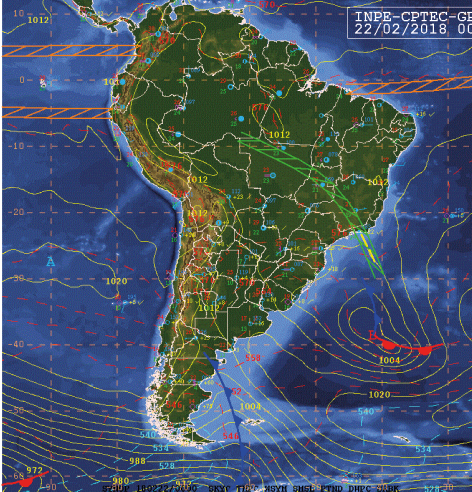 On February 22 late morning (Figure 2a), a near-saturated (moisture availability) unstable-temperature atmospheric layer is observed from surface to 600 hPa; a dry layer is observed from 600 hPa to the upper atmospheric levels. In early afternoon (Figure 2b) and mid-afternoon (Figure 2c), a progressive increase of moisture is observed from surface to upper levels. Large potential energy (gray shaded area on SkewT/logP diagram) is observed in all soundings on this day, driving an air parcel ascending vertically from the LFC to the LNB (Figure 2) with CAPE values reaching above 3000 J.Kg–1 (Houze, 1993; Schultz et al., 2000). This potential energy was mainly related to the presence of the South American Convergence Zone (SACZ), which configures the northwest flow and brings warmer and moister air from the Amazon region towards the metropolitan area of Rio de Janeiro (Ferreira et al., 2004; Quadro et al., 2012), where lower atmospheric levels show local instability from solar heating and evapotranspiration near the surface during warm season (Doswell, 2001). Figures 5S and 6S show the corresponding satellite image and surface charts provided by the Center for Weather Forecasting and Climate Studies (http://satelite.cptec.inpe.br/home/index.jsp), indicating the SACZ configuration over South America. In addition, the SACZ also provides a dynamic environment favorable for upward air motion, reinforcing the deep convection observed in Figure 3S (Mota and Nobre, 2006; Tavares and Mota, 2012; Gille and Mota, 2014).