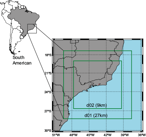 The dynamic parameters were calculated using Weather Research and Forecasting (WRF) model (Skamarock et al., 2008) version 3.8. The model was configured with two nested domains, with horizontal spatial domain resolutions for coarse grid (d01) and fine grid (d02) of 27 km and 9 km, respectively, 27 vertical levels with the highest level at 50 hPa, and 4 vertical levels of soil. The green squares in the Figure 1 show the horizontal domains used. The physical parameterizations selected were: the WRF single-moment 3-class microphysics scheme (Hong et al., 2004), the Kain-Fritsch cumulus parameterization scheme (Kain 2004), the Rapid Radiative Transfer Model for longwave radiation (Mlawer et al., 1997), the Dudhia shortwave radiation scheme (Dudhia, 1989), the Unified Noah land surface model (Tewari et al., 2004), the Revised MM5 Monin-Obukov (Jiménez et al., 2012) for surface layer, and the Yon-Sei University Planetary Boundary Layer parameterization scheme (Hong et al., 2006). Initial and lateral boundary conditions were obtained from the Global Forecast System (GFS, http://www.emc.ncep.noaa.gov/GFS/doc.php) at six-hour intervals and horizontal resolution of 0.50º x 0.50º and provided to the WRF model.
