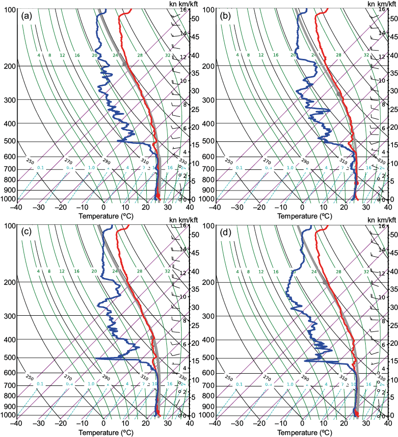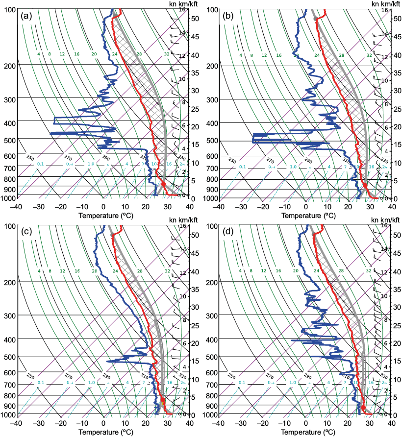 A similar vertical profile of moisture is observed on March 03, 2018 compared to February 22. However, for all sub-daily soundings launched on March 03, a more saturated atmospheric layer is observed from surface to 550 hPa (Figure 3). We observed no significant potential energy (gray shaded area) during this day. Such condition indicates the importance of a dynamic mechanism in the development of stratiform clouds (Figure 4S) within a moisture content local cloud scale environment in the absence of significant CAPE (Doswell, 2001; Itterly et al., 2018).