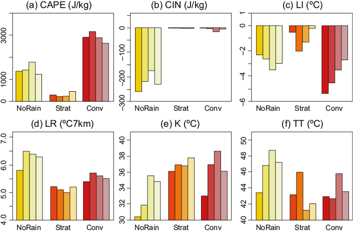 In light of the above, this study endeavored to intercompare the performances of thermodynamic parameters and investigate the dynamic triggering conditions over different atmospheric scenarios, classified as convective, stratiform, and nonprecipitating events, in the metropolitan area of Rio de Janeiro on selected days between November to March 2018. Before further discussion, it is important to point out that the results could have some implicit bias due to the short study period adopted. As such, the main goal of these analyses is not to establish thresholds, but rather to evaluate qualitative and quantitative differences regarding the cloud types categorized. Finally, this work attempted to support surveys that could be used by operational forecasters and also didactical local trainings.