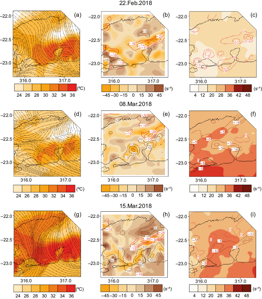 On February 22, wind circulation at 850 hPa shows a northwest flow advecting moist and warm air from the Amazon region towards the metropolitan area of Rio de Janeiro (Figure 6a) and the adjacent Atlantic Ocean (Figure 7a) at 15 UTC and 17 UTC. Such atmospheric pattern is related to the configuration of SACZ (Teixeira and Satyamurty, 2007). It is possible to observe a coupling between convergence (negative lines over negative areas) in the lower atmospheric levels (Figure 6b and 7b) and divergence at the upper levels (Figures 6c and 7c). This behavior shows an atmospheric vertical structure promoting a dynamic mechanism to lift air parcels and develop convective clouds (Doswell, 1987; Tajbakhsh et al., 2012). Weak wind shear is also observed, which can create an atmospheric environment to develop heavy rainfall (Silva et al., 2017).