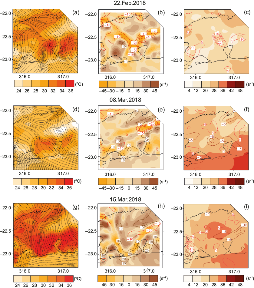 On March 15, the pattern of convergence and divergence at lower (Figures 6h and 7h) and upper layers (Figures 6i and 7i) is similar to March 8. The main difference was observed for wind circulation at 850 hPa, which showed a northeast component over Rio de Janeiro city. As a consequence, this scenario promoted a decrease of moisture and thermodynamic availability favoring cloud formation but without the potential for droplet growth and precipitation (Moraes et al., 2005; Moura et al., 2013).