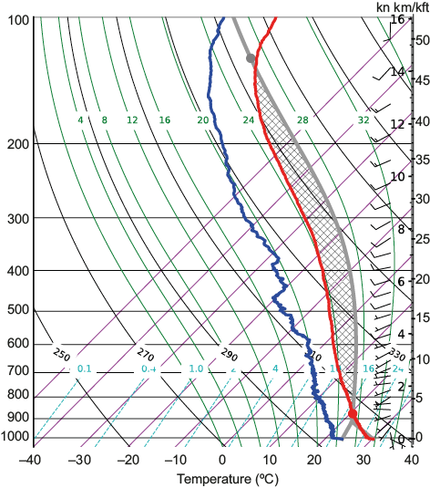 On March 15, the SkewT/logP diagrams (Figure 4) show CAPE and an unstable temperature profile, which corroborates the warm season daily cycle of solar heating warming the troposphere by conduction of atmospheric layer closest to the surface and subsequent convection (Seidel et al., 2005). However, in contrast to February 22 and March 03, significan CIN (beige area in the SkewT/Log P diagrams) is observed, requiring the need for dynamic forcing in order to develop clouds (Doswell, 2001).