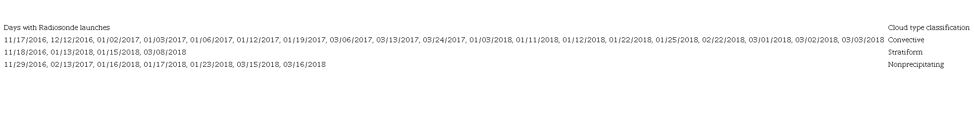 We selected three days for initial discussion during which these cloud types were observed over the study region: 02/22/2018, characterized by convective clouds (Figure 3S); 03/08/2018, characterized by stratiform clouds (Figure 4S); and 03/15/2018, characterized by nonprecipitating clouds. These days were also selected since they had the same number of radiosondes launched at the same hours, i.e., 15 UTC (12 Local Time (LT)), 17 UTC (14 LT), 19 UTC (16 LT) and 21 UTC (18 LT). Subsequently, the results considering all the selected days presented in Table I are also discussed.