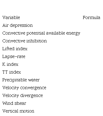 In the formulas of the variables presented in Table II, T and Td represent air and dewpoint temperatures (measured in degrees centigrade (ºC)), respectively, while the subscripts refer to surface (SFC) or isobaric levels (hPa). Tp expresses the temperature of a lifted parcel (using the parcel method) at 500 hPa; Tvp and Tv (also in ºC) characterize the virtual temperature of a lifted parcel and the surrounding environment temperature, respectively. LFC represents the level of free convection (i.e. lifted parcel is warmer than surrounding environment), while LNB represents the neutral buoyancy level. The physical interpretations of the variables in Table II are briefly described below.
