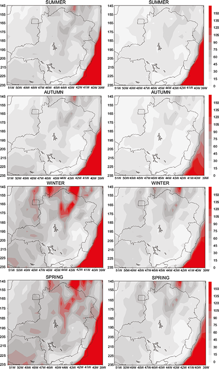 Values of WPD depend on the wind turbine model with different power coefficients (cp), as expressed in Eqn. 3. Figure 9 presents the seasonal average of WPD at 100m, considering the air density equal to 1,225 kg m–3. The left column in Fig. 9 disregards the maximum power conversion estimated by the Betz Law, which shows maximum yield from a wind turbine to be 59.3% (Manwell et al., 2009). WPD results show lowest values during summer and fall, below 70 W m–2 with higher values in the north and lower values in the south of MG. During winter and spring values are higher, reaching 150 Wm–2 in the north region. The right column (Fig. 9) shows WPD seasonal average at 100 m, considering the maximum power conversion estimated by the Betz Law, resulting in an approximate 60% reduction compared to the right column. As cp values depend on the wind turbine chosen, such reduction is variable, and it should be taken into account in the calculations as it influences the relationship between wind speed and generated power density.