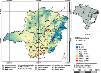 To verify how the GFS analyses represent the weather conditions in the state, observations at 10 m from twelve weather stations between 2013 and 2017 were used (Table I). These weather stations belong to the National Institute of Meteorology (INMET) and were chosen according to the mesoregions of the State of MG. These regions were defined, based on economic and social similarities, by the Brazilian Institute of Geography and Statistics (Brazilian Institute of Geography and Statistics - IBGE, 2018). For comparison, GFS data were extracted from the nearest grid points of the weather stations. Figure 1 shows the location of the stations and terrain elevation through the state. In the south, the altitude is higher, characterized by the Mantiqueira Mountains (Serra da Mantiqueira). In the north the altitude is more heterogeneous, with the Espinhaço Mountains (Serra do Espinhaço) and the São Francisco River Depression, for example (CEMIG, 2010).