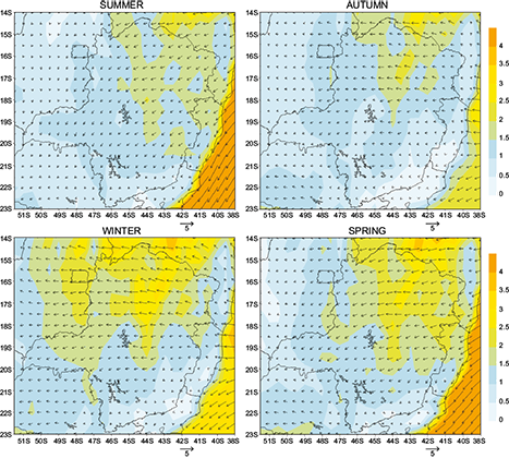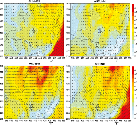 Wind seasonal averages at 10 and 100 m are shown in Figures 2 and 3, respectively. Wind averages vary over the seasons due to intensification or weakening of atmospheric systems, mainly associated with the South Atlantic Subtropical Anticyclone (SASA), South Atlantic Convergence Zone (SACZ), and Frontal Systems (Reboita et al., 2010; Reboita et al., 2015; Reboita et al., 2019).