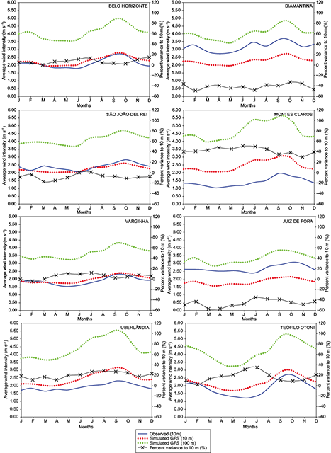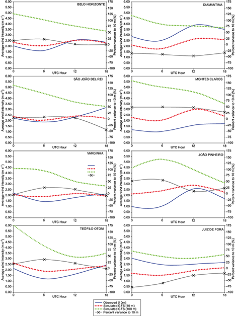 The comparison between observed and GFS profiles showed similar patterns in most sites (Fig. 5). Best results were found for Belo Horizonte, São João del Rei and Varginha (municipalities where the stations are located in areas with few obstacles, in general, with undergrowth or agricultural plantations), while greater differences can be observed in Diamantina, Montes Claros and Juiz de Fora where stations are located in areas with larger obstacles (such as high rocks in the case of Diamantina) or residential areas (in Montes Claros and Juiz de Fora). In general, the GFS model overestimated values at 10 m when compared to the observations, except in Diamantina, Juiz de Fora and São João Del Rei (also shown by the percentage changes).