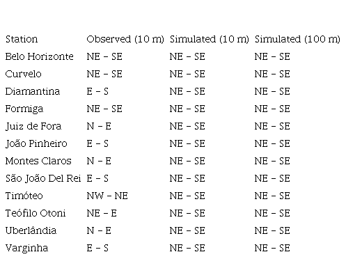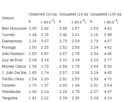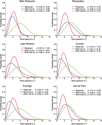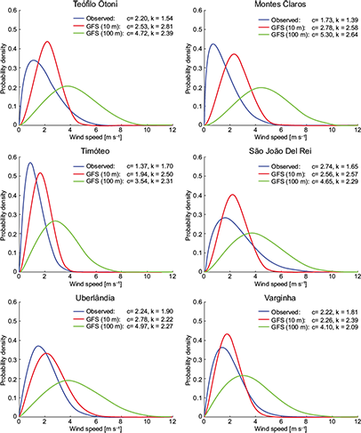 Statistics are used in wind studies to represent wind variability and evaluate its evolution, with respect to average values and the probability of occurrence of extreme values, and facilitate the comparison between data sets. When the Weibull shape parameter k presents high values, it indicates little variability of the wind speed around an average value, whereas the parameter c indicates the average value of the data. For observations at 10 m at all sites, k values ranged between 1 and 2.16. The values of c presented greater variability, as can be seen in Table IV. According to Patel (2006), when k is equal or close to 1 the Weibull distribution approaches an exponential distribution, as in the case of Montes Claros (top-right panel in Fig. 8, blue line), and it indicates that most days registered calm or very weak winds. When k values equal to or close to 2 (Rayleigh distribution), such as in Belo Horizonte, Diamantina, Juiz de Fora and Uberlândia, present standard distributions of wind speeds (found in most places), and in these cases most days have speeds below the average speed.