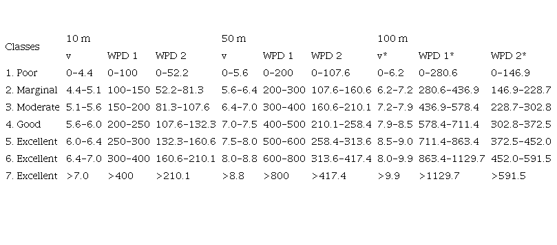 Elliotti et al. (1991) previously used WPD = 0.955 ρv3 to calculate tables of wind power density classification for winds measured at 10 and 50 m. Table II is a modified version of the one presented in Elliotti et al. (1991), comparing original WPD estimates with those calculated from Eqn. 3 and including data at 100 m.