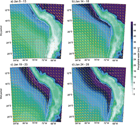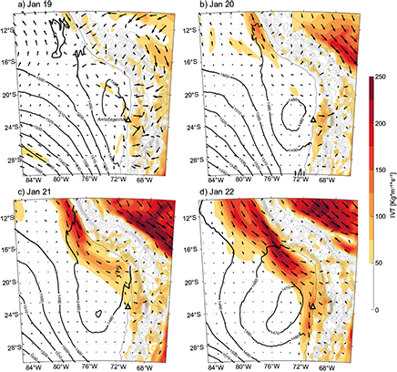 While on 19 January the cyclonic circulation offshore northern Chile extended to 850 hPa (Fig. 10a), there was yet no evidence of moisture advection. It seems that the formation of the low triggers the southward humidity flow in the lower troposphere one day later, when a narrow of IVT < 150 kgm–1s–1 appeared offshore Peru (12ºS) transporting humidity toward the Atacama Desert through an atmospheric river-like structure. On 21 and 22 January, relatively high levels of IVT (100 to 150 kgm-1s-1) are observed in northern Chile (Fig. 10c and d) north of 24ºS. Those were the wettest days in the Lowlands and Pampas (Fig. 3a), indicating a potential strong link between humidity transport and rainfall. The advection of humidity between 900-700 hPa levels agreed well with the sounding observations at Antofagasta, where the mixing ratio increased from less of 2 g/kg during the “dry period” to more than 6 g/kg during the “wet period” and reached ~10 g/kg in the 880-760 hPa layer during the wettest day on the Precordillera (23 January). Positive zonal winds between 900-800 hPa were observed in the ADC area (Fig. 8d) throughout the “wet period”, with averaged afternoon (12-18 UTC) values of about 5m/s and above the 90th percentile for this period. Such unusually strong westerlies transported humidity inland ahead of the low-level cyclonic system located offshore.