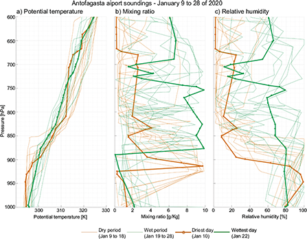 The vertical profiles of potential temperature during the “wet period” (19 to 29 January) show a warmer (1-3 K) and moister (2-3 g/kg) boundary layer with respect to the “dry period”. In contrast, the “wet period” is characterized by a cooler free troposphere by, up to -3 K between 900 and 750 hPa. Figure 10b shows humidity increase above the Atacama coast, with mixing ratios of 8 to 10 g/kg between 900 and 750 hPa during the wettest day at this location (22 January 22) and relative humidity ~ 60-70%,