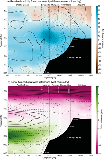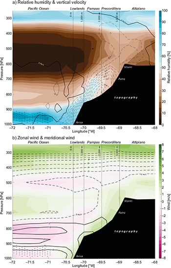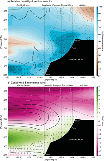 Average relative humidity, vertical velocity, zonal and meridional wind from ERA-5 for the driest day of the period (10 January) are shown in Figure 12 as vertical cross-sections at 18-20ºS and 72-68ºW. A deep dry layer (dark brown colors in Fig. 12a) is seen west of the Andes over the Atacama Desert and offshore, with very low values ~ 5-20%. This area of low RH is located between 900-500 hPa, with a minimum near ~650 hPa, in agreement with the Antofagasta sounding about 400 km to the south (Fig. 11c). Positive vertical velocity (in Pa s–1) is observed in the same region inhibiting cloud formation above the marine boundary layer. In contrast, ascent (negative vertical velocity) is seen in the layer near the ground over the Atacama Desert, from the coast to the Altiplano. This region coincides with westerly zonal winds (green colors in Fig. 12b) during the afternoon of the driest day with values around 2-4 m/s, indicating an inland flow between Lowlands and Altiplano.