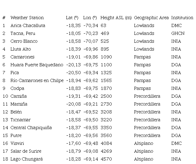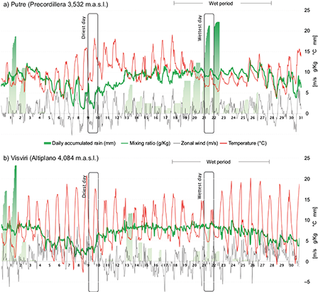 Hourly data of 2 m temperature, mixing ratio, zonal wind and precipitation were obtained from the DMC weather station Putre (located less than 1 km from Putre station listed in Table I) and Visviri (listed in Table I).