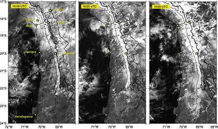 In summary, an enhanced local circulation is present during the wettest day over the Atacama Desert, with more intense than usual northeasterlies advecting humidity from the coast toward the Atacama Desert below 500 hPa. Forced topographic ascent leads to cloud formation and thunderstorms mainly over the Precordillera, spreading toward the Altiplano and the Lowlands in the afternoon, enhancing precipitation across southern Peru and northern Chile mostly in areas below 3600 m.a.s.l.
