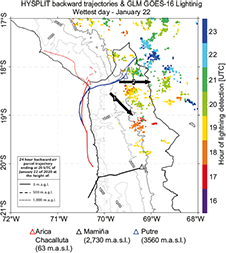 The Hybrid Single-Particle Lagrangian Integrated Trajectory model (HYSPLIT), developed by the Air Resources Laboratory at NOAA (Stein et al., 2015) is used to compute nine backward trajectories based on the GFS model at 0.25º x 0.25º horizontal resolution. Each modeled trajectory from 21 January at 20 UTC to 22 January at 20 UTC ends at 0, 1000 and 1500 m.a.g.l., above the locations of Arica, Mamiña and Putre. The model is freely available from NOAA.