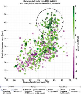 In order to assess the frequency of occurrence of these combined synoptic and thermodynamic features in northern Chile during austral summer, we compute the joint distribution of daily SST, PWV, and afternoon low troposphere zonal wind averaged in a box located offshore Atacama (70-75ºW, 18-20ºS) for DJF between 2008-2020. As can be seen in Figure 18, summer SSTs range from 20ºC to 27ºC offshore the Atacama Desert and PWV range between 15 mm to 50 mm. Zonal winds are mostly westerly, with a climatological average around 0.5 m/s but ranging from -5 to 5 m/s. Figure 18 also includes the extreme precipitation (EP) days in several weather stations located in the Lowlands, Pampas and Precordillera, above the 90th percentile thresholds of rainy days (see values in Table II), evidencing that most of EP days (dotted line circle) occurred under high SST and high PWV values, and also under low troposphere westerly winds. This is especially true for locations in the Lowlands, Pampas, and Precordillera where the combination of SST between 23-26ºC, PWV 37-52 mm, and zonal wind 2-6 m/s can potentially trigger EP. Most EP days observed in the Lowlands and Pampas occurred under this combination of variable ranges. Stations Mamiña (2730 m.a.s.l.) and Putre (3560 m.a.s.l.) in the Precordillera also recorded almost all EP days in the upper-right quadrant of Fig. 18. It is surprising that even in the higher regions of the Precordillera close to the Altiplano, there is a strong influence of this new thermodynamic mechanism, since 30 of the 39 events of extreme precipitation in Putre occurred under high SST, high PWV (inside the dotted circle in Fig. 18) and westerlies.