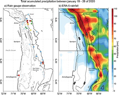 The Atacama Desert hyperaridity is abruptly altered every few years by extreme precipitation events. Such events are associated with at least three distinct patterns: cold fronts, cut-off lows, and the summer monsoon. During austral winter, extended troughs associated with surface cold fronts can reach as far as north as Antofagasta (23ºS), resulting in heavy rainfall in the Lowlands and coastal cities, often leading to mudslides and flows of debris (Vargas et al., 2000). In late summer, autumn and spring, cut-off lows can also produce EP events. In March 2015 a cut-off low displaced equatorward (Barrett et al., 2016; Rondanelli et al., 2019) triggered large accumulated rainfall in less of 72 hrs between Antofagasta and Atacama Regions (22-25ºS), producing catastrophic flows that destroyed several cities (Sepúlveda et al., 2014). This event killed 50 people and produced damages for $2.6 billion dollars (Kreft et al., 2016). The almost unseen level of destruction in northern Chile stimulated meteorologists and scientists to study the mechanisms leading to major precipitation in the area. Thus, several studies (Barrett et al., 2016; Bozkurt et al., 2016; Jordan et al., 2019) identified the two main factors present during the March 2015 event: anomalously warm sea surface temperature off-shore the Atacama Desert and advection of anomalous precipitable water from the eastern tropical Pacific toward northern Chile.