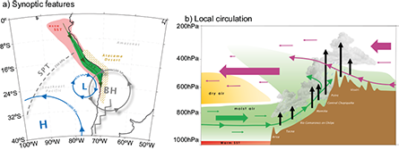 A conceptual model of the synoptic and local circulation mechanism is summarized in Figure 19. Large scale features (Fig. 19a) include the presence of the SPT (gray dashed line) offshore Peru and the BH centered at 24ºS over the Andes (gray circle) above 500 hPa. The key feature in the lower troposphere is the presence of a low-pressure cyclonic system offshore the Atacama Desert (blue circle) advecting high PWV through an “atmospheric river-like” structure toward the desert (green strip). Warmer than normal SST along the Peruvian-Chilean coast also contributes to increase near-surface humidity. The local circulation (Fig. 19b) shows strong westerlies at 900-700 hPa (green arrows) advecting humidity toward the western slope of the Andes, enhancing clouds and precipitation from the Lowlands to the Precordillera. Easterly winds (pink arrows) above 500 hPa are associated with the northern sector of the BH.