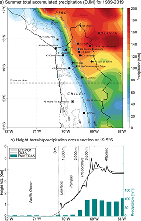 Between 2017 and 2020, at least four episodes of intense rainfall occurred in the Atacama Desert during January and February that resemble the January 2020 event (DMC, 2017; DMC, 2019). The monsoon mechanism in the Altiplano could be a possible explanation for these EP events in Lowlands and Pampas of the Atacama Desert. According to Reyers et al. (2021), strong easterly winds above Atacama can lead to the displacement of convective storms from the Altiplano toward the coast. However, it must be considered the effect of above-normal sea surface temperature (SST) and anomalous precipitable water vapor along the Peruvian-Chilean coast, identified as key components in other previous events in the Atacama Desert, suggesting a thermodynamic potential connection with EP events in areas below 3600 m.a.s.l. Topography and forced ascent can also play an important role, since as Figure 2b shows, there is an abrupt increase in height from west to east due to the presence of Andes cordillera, from sea level to 4000 m in less of 1.5º of longitude (~300 km). Therefore, several questions arise about the source of humidity and instability triggering EP events in the Atacama Desert, and also about the local and synoptic mechanisms leading to summer precipitation in one of the driest deserts of the world.
