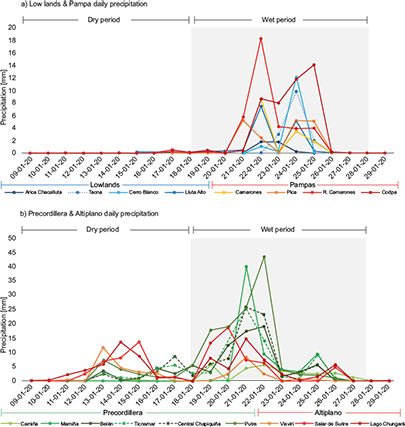 Analysis from surface weather stations helped to determine special features of this rainfall episode. For example, a “dry period” was observed between 9 and 18 January, with almost no rainfall in the Lowlands and Pampas. A “wet period” was observed after 19 January in weather stations located below 2000 m.a.s.l., recording almost-daily rain between 21 and 26 January. The maximum daily rainfall intensity was recorded on 22 January in Río Camarones en Chilpe (red line in Fig. 3a) with 18 mm/day and on 25 January in Codpa (dark red in Fig. 3a) with 14 mm/day. On 22 January, precipitation was recorded in main cities located on the coast, between 3.8 and 1.0 mm in Arica (dark blue lines in Fig. 3a) and Iquique (20.3°S, not shown), respectively. Precipitation also increased in the Precordillera (green lines in Fig. 3b) on 19 January, reaching maximum intensity on 21 January at Mamiña with ~39.9 mm/day, and 25 mm/day in Central Chapiquiña and Ticnamar (green lines in Fig. 3b). Putre recorded the highest accumulation among all weather stations on 22 January with 43.5 mm. The “wet period” ended on 28 January in the Precordillera, Pampas and Lowlands. In contrast, the precipitation regime was similar before and after 19 January in the Altiplano (red lines in Fig. 3b), with maximum daily intensity less than 17 mm/day.