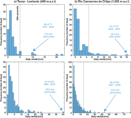 The frequency distribution of daily precipitation from high-quality data of the last decades, allows the determination of a threshold for extreme precipitation (hereafter, EP) corresponding to the 90th percentile of daily precipitation (Table II). Note that six of the seven weather stations recorded a day with EP during the second half of January 2020 and at least two weather stations recorded the strongest daily intensities. Tacna weather station (469 m.a.s.l., letter A in Table II), located in the Lowlands, recorded 9.9 mm on 25 January, corresponding to the fifth strongest precipitation in 48 years of data (Fig. 4a). Río Camarones en Chilpe in the Pampas, recorded the highest daily value in sixteen years of data with 18.3 mm/day (Fig. 4b). Another record-breaking precipitation occurred in Mamiña (2730 m.a.s.l., letter E in Table II) with the highest maximum daily intensity in 35 years of data with 39.9 mm/day on 21 January (Fig. 4b). The city of Putre (3560 m.a.s.l., letter F in Table II), located at the edge of the Precordillera, recorded the highest daily precipitation among all weather stations and the fifth strongest rainfall day (43.4 mm, 22 January) among all daily records (474 days) between 2001 and 2020 (Fig. 4d).
