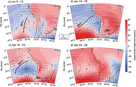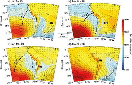 As the previous sections demonstrated, the period between 9 and 18 January was mostly dry, especially in the Lowlands, Pampas, and Precordillera. During the first part of the “dry period”, 9-13 January, the BH was centered over southeastern Brazil, as can be seen in Figure 6a. A trough was simultaneously located over the Southeast Pacific at 250 hPa (denoted as SPT, Fig. 6a), with northerly flow in the mid and upper troposphere over the Atacama Desert. The geopotential anomalies field shows an anomalous trough (SPT* in Fig 7a) located south of 8ºS in the southeast Pacific, with anomalies of about -30 to -60 m. Simultaneously, the anomalous ridge that accompanies the BH is located to the west of the coast of South Brazil. Near the surface at 850 hPa, the west coast of South America was under the margin edge of the subtropical high, with slightly positive values anomalies (Fig. 7a) and mostly southern winds along the Peruvian-Chilean coast (Fig. 6a). In the second part of the “dry period” (between 14 and 18 January), the center of the BH was displaced westward (Fig. 6b), and reached ~120 m above the January climatology for 250 hPa geopotential height over Central Argentina. Simultaneously, the SPT moved slightly eastward (Fig. 6b) with a southwest-northeast extension in both total magnitude and anomalies (Fig. 7b). A relative low-pressure system at 850 hPa at 20ºS formed offshore Atacama (Fig. 6b) with a closed geopotential minimum over this area, with geopotential heights at 850 hPa ~15 m below climatology (Fig. 7b). Note that 850 hPa geopotential anomalies show a sharp gradient between the southeast Pacific, with negative values, and the Amazon Basin, with positive anomalies. It seems plausible that the SPT and BH, located on different sides of the Andes, combine to affect the lower troposphere. And while the offshore low-pressure system (L and L* in Figs. 6b and 7b) was not evident as a closed isobar at the surface, it did result in a decrease in sea level pressure along the Peruvian-Chilean coast. For example, the sea level pressure in Antofagasta (23.5ºS, Fig. 8a) reached a minimum of 1009 hPa (below the daily 10th percentile) on January 17, coinciding with the end of the “dry period”.