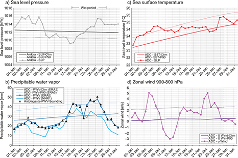 The presence of anomalous PWV offshore central and northern Chile could be a major factor leading to intense rainfall in the area, as suggested by Fuentes (2014), Barrett et al. (2016), and Rondanelli et al. (2019). During the catastrophic EP event in March 2015 that lasted several days, anomalous PWV were transported from the tropical eastern Pacific toward northern Chile by a cyclonic configuration generated by a deep cut-off low. Such humidity advection along the Peruvian-Chilean coast combined with the instability ahead of the cut-off low and also with a forced ascent due to the Andes, resulting in the EP event of 2015. Bozkurt et al. (2016) mentions also the presence of warm SST anomaly offshore the Atacama Desert associated with the 2015-2016 El-Niño onset that favored anomalous PWV due to thermodynamic processes in the MBL. Both the anomalous PWV and warmer SSTs in the ADC area (Fig. 7c) were present during the “wet period” in January 2020, highlighting a potential relationship with the extreme precipitation event in the Atacama Desert.
