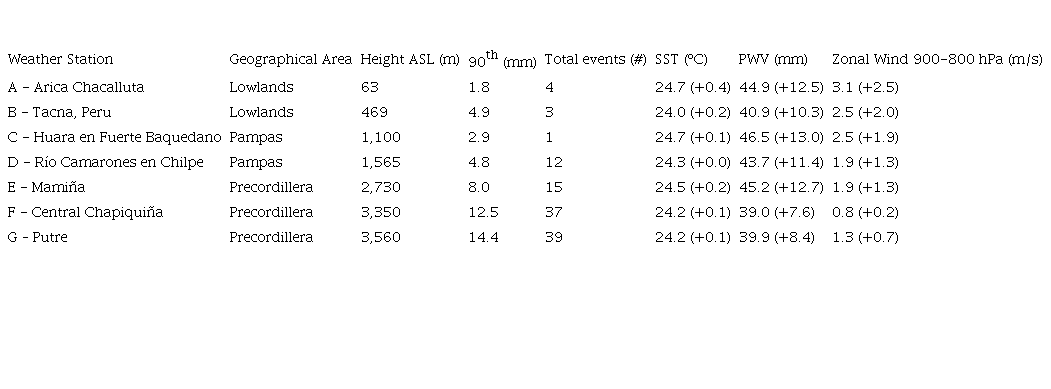 The results here presented indicate that in January 2020, a combination of a BH displaced poleward with an SPT offshore Peru were conducive to the formation of a low pressure/cyclonic circulation offshore the Atacama Desert between 900-700 hPa, inducing northwesterly winds along the Peruvian-Chilean coast. These winds advected high PWV resulting in anomalies of between 10-30 mm above climatology, through an “atmospheric river-like” structure (IVT < 250 kgm-1s-1) along the coast, weakening subsidence and dry conditions in the Atacama Desert. In addition, above normal offshore SST (+0.5 to +1.0ºC) increased near-ground temperature and mixing ratio, efficiently moistening air parcels from the surface to ~600 hPa. Moist air was advected eastward (e.g., from the coast to the Precordillera) by the circulation ahead of the anomalous low-pressure system. Forced topographic ascent of such moist air triggered instability and convection, leading to thunderstorms and intense rainfall over the western slope of the Andes, from southern Peru to northern Chile (18 to 23ºS). Table II summarizes the average of SST, PWV, and low troposphere zonal wind during the EP days, including anomalies from climatology. While care should be taken due to the relatively small number of events, they nevertheless can be useful for short-range forecast of EP events in climatologically dry areas where even a single day of intense precipitation can lead to major impacts on population and infrastructure.