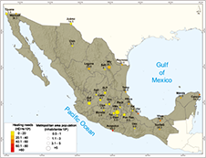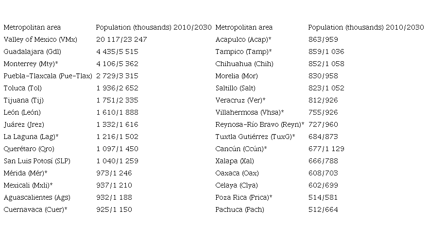 (9)The population forecast (P) as the number of inhabitants in each urban area for the 2030s was used for future projections (Table I, approximately when the 1 ºC mean global warming time horizon is met). The value remained unchanged since CONAPO (2006) calculates that the national population will undergo a very slow growth from 2030.