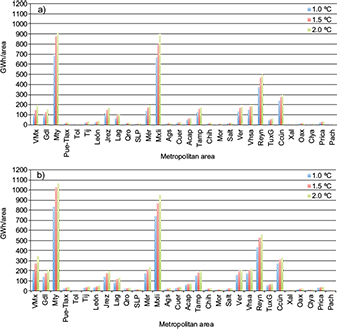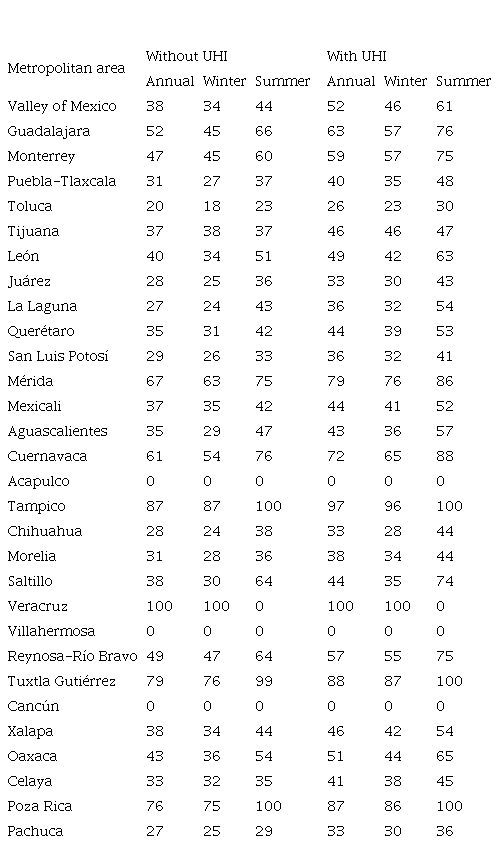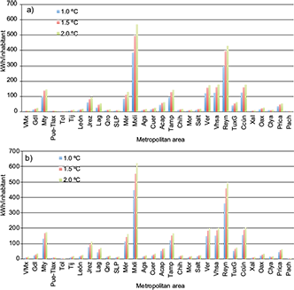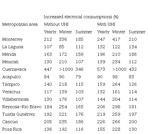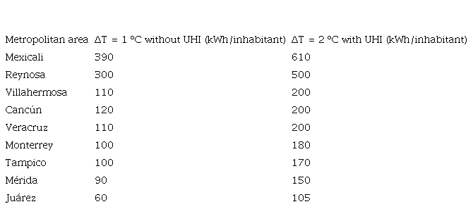 Table V shows the increase intervals in electricity consumption for cooling per inhabitant. This is expected to exceed the 100 kWh per inhabitant in metropolitan areas, and ranges from a minimum increase (ΔT = 1 ºC without UHI) to a maximum one (ΔT = 2 ºC with UHI). The largest increase will occur in northern Mexico and in urban coastal areas of the Gulf of Mexico and the Caribbean. As previously mentioned, the results of the works cited in the introduction and those of this work correspond in order of magnitude to the percentage of consumption per inhabitant.