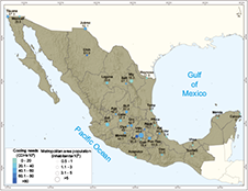 Figure 3, similar to Figure 2 but applied to the entire population in each metropolitan area, shows increases in cooling needs. Monterrey has a larger expansion because of its population. While usage in metropolitan areas in central Mexico will increase minimally, none of them display a reduction in consumption for cooling.