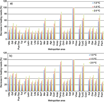 Heating needs are certainly expected to decrease under global and local warming scenarios due to urbanization. Results of this study show that the percentage reduction (over 50%) will be greater in warm places like Mérida, Tampico, Veracruz, Tuxtla Gutiérrez, and Poza Rica. Acapulco and Cancún already used no heating in the base period. Cold areas like Toluca, Pachuca, and Tijuana will decrease use by 15 to 30%, considering the UHI. The decrease in the remaining areas will be between 25 and 60%. However, it is important to note that temperate metropolitan areas (Aguascalientes, Celaya, Cuernavaca, Guadalajara, León, Morelia, Oaxaca, Pachuca, Puebla-Tlaxcala, Querétaro, Saltillo, San Luis Potosí, Tijuana, Toluca, Xalapa, and Valley of Mexico) experience extreme minimum temperatures below 5 ºC in the base period, and it is very likely that cold waves will continue to affect them in the future.