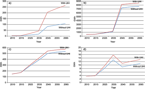 Time trends in decadal consumption for four representative areas are shown in Figure 6. As an example, Puebla-Tlaxcala displays a similar behaviour to other temperate zones, such as Toluca, León, Morelia, San Luis Potosí, Aguascalientes, Querétaro, Tijuana, and even the Valley of Mexico. The main difference is the population size in each of them. The trend seen for Monterrey is representative of the pattern seen in other northern warm areas during summer such as Mexicali, Ciudad Juárez, La Laguna, Saltillo, and Reynosa. Note that cooling needs in these northern areas are almost independent of the UHI. This is slightly different in metropolitan areas of the humid tropics like Cancún, Veracruz, Tampico, Acapulco, Tuxtla Gutiérrez, Mérida, and Villahermosa. Three areas are an exception: Celaya, Poza Rica, and Pachuca. CONAPO estimates that population in those areas will decline before mid-century.